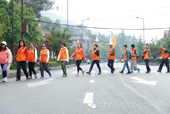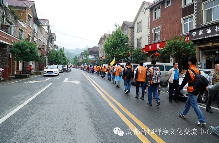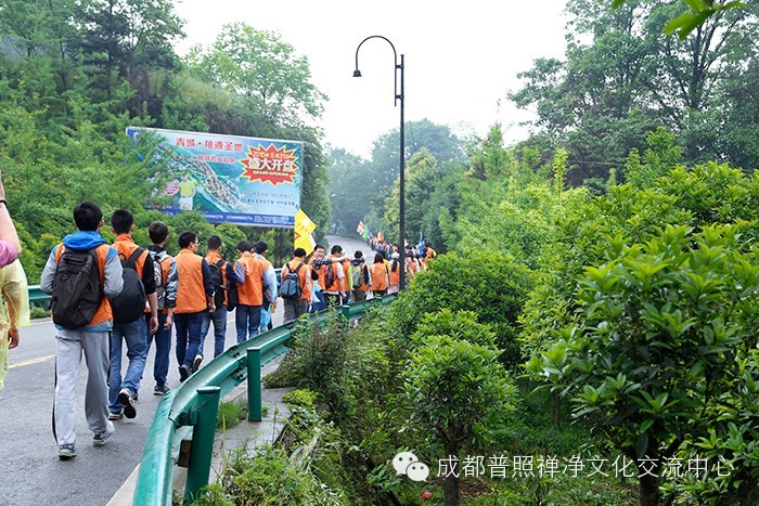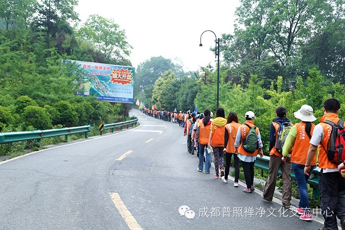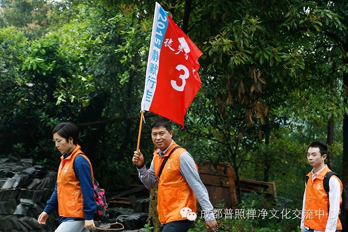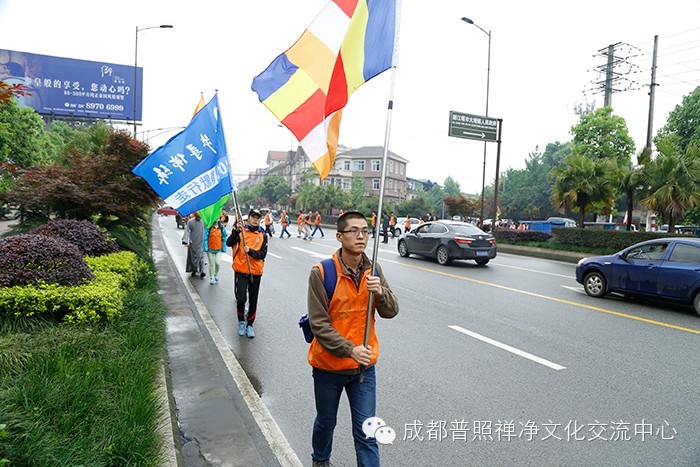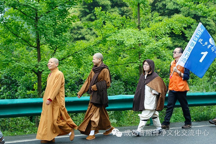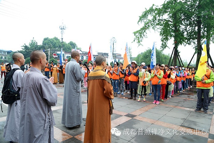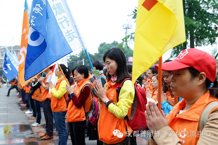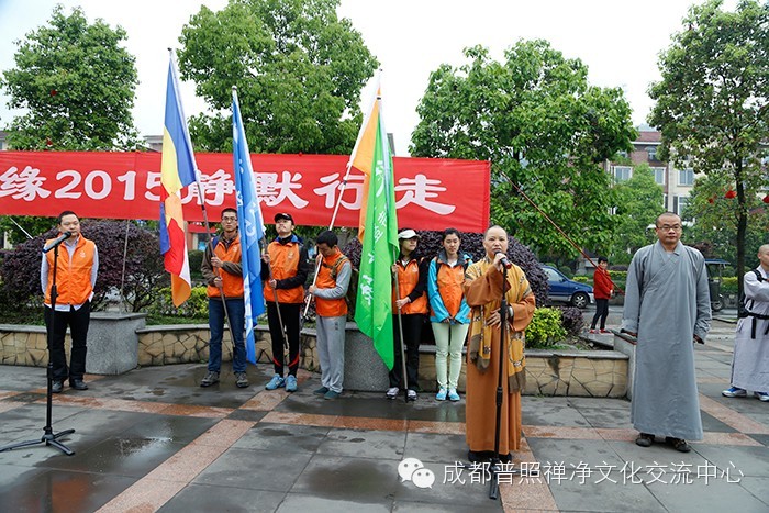 上午9点时刻,由天国寺住持宏开法师主持诵念心经,并邀请都江堰市佛教协会会长、普照寺住持果证法师向参加徒步的代表授予旗帜,随后宏开法师发起出发号令,天国寺2015静默徒步寻佛活动盛大开步行走。