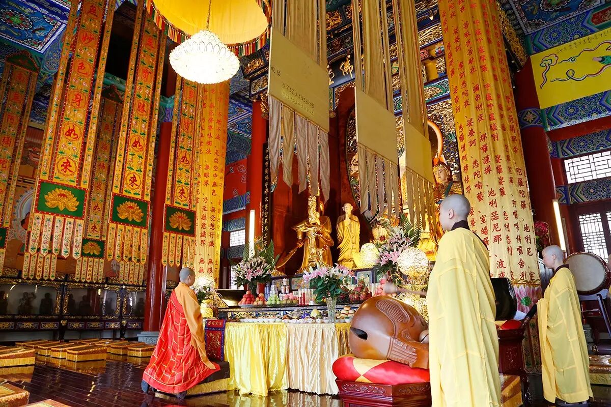 今日农历七月十五,是传统的七月半、佛教的盂兰盆节,青城山普照寺为期七天的盂兰盆报恩孝亲法会在今日圆满举行。上午十一点整,普照寺住持果证法师率所有常住法师前往大雄宝殿,殿内五果百味,香色清新,陈设佛前,供养十方三世诸佛贤圣。
