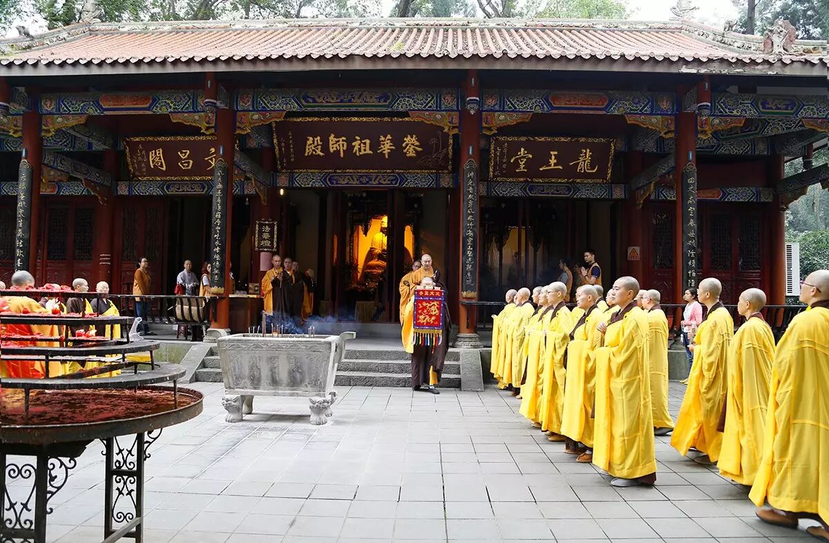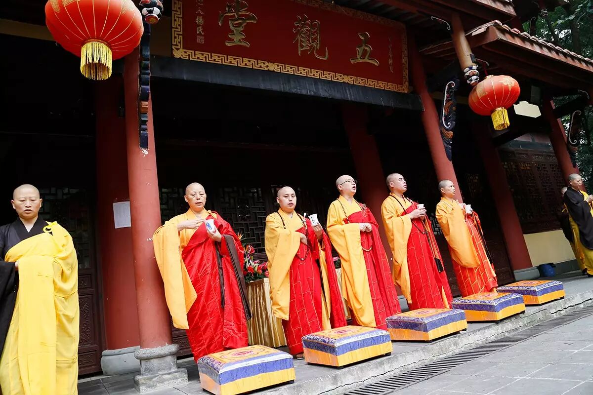 熏坛洒净仪式于下午15:30分准时开始,法会首先迎请五位主法法师进入大雄宝殿,随后主法法师拈香、持咒,随后分别走向五观堂、山门、蓥华祖师殿、燃灯殿、选佛场、净土老禅堂、地藏殿、药师殿、财神殿等殿堂处一一熏坛洒净。